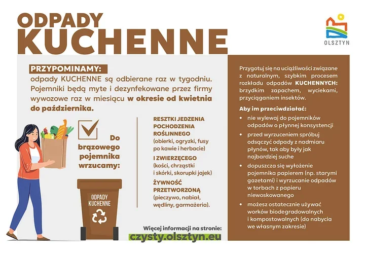 W Olsztynie firma wywozowa ma myć i dezynfekować pojemniki raz w miesiącu, od kwietnia do października. Odbiór odpadów kuchennych odbywa się raz w tygodniu, więc przy większych ilościach szczególnie warto pilnować, by do środka trafiało jak najmniej wilgoci.
