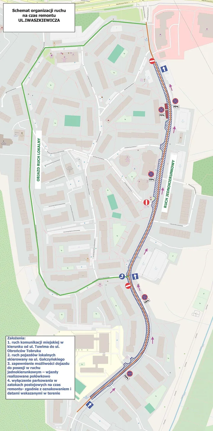 - parkowanie w zatokach postojowych będzie czasowo wyłączone zgodnie z oznakowaniem ustawionym w terenie.