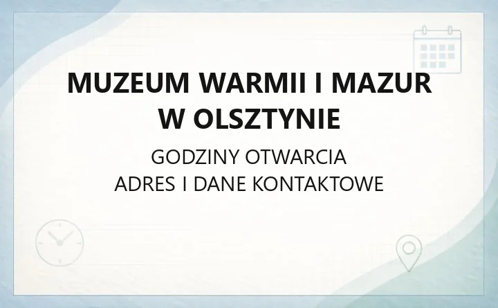 Muzeum Warmii i Mazur w Olsztynie ma siedzibę w Zamku Kapituły Warmińskiej przy ul. Zamkowej 2. To główna placówka muzeum, które działa również w kilku oddziałach w regionie. Poniżej znajdziesz adresy, telefony, godziny otwarcia (w okresie 1.10–31.05), ceny biletów i najważniejsze usługi.