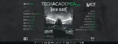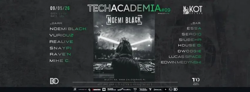 W Olsztynie zapowiada się noc dla fanów mocnego elektronicznego grania bez kompromisów — 9 maja w KOT art bar wraca TECHACADEMIA #09, a główną gwiazdą wieczoru będzie NOEMI BLACK. Na miejscu czekają dwa parkiety, solidny skład z różnych stron kraju i klimat, który długo zostaje w pamięci. To jedna z tych imprez, które po prostu warto mieć na radarze.